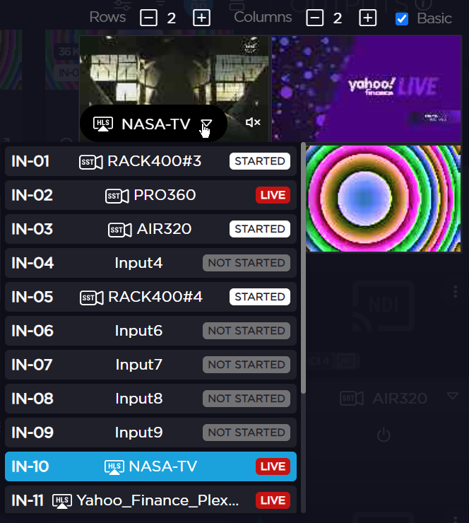 The Multi-View feature allows you to monitor any combination of inputs received by StreamHub on a single screen. You can use it to monitor up to 16 videos sources, with optional audio meters added on all videos.