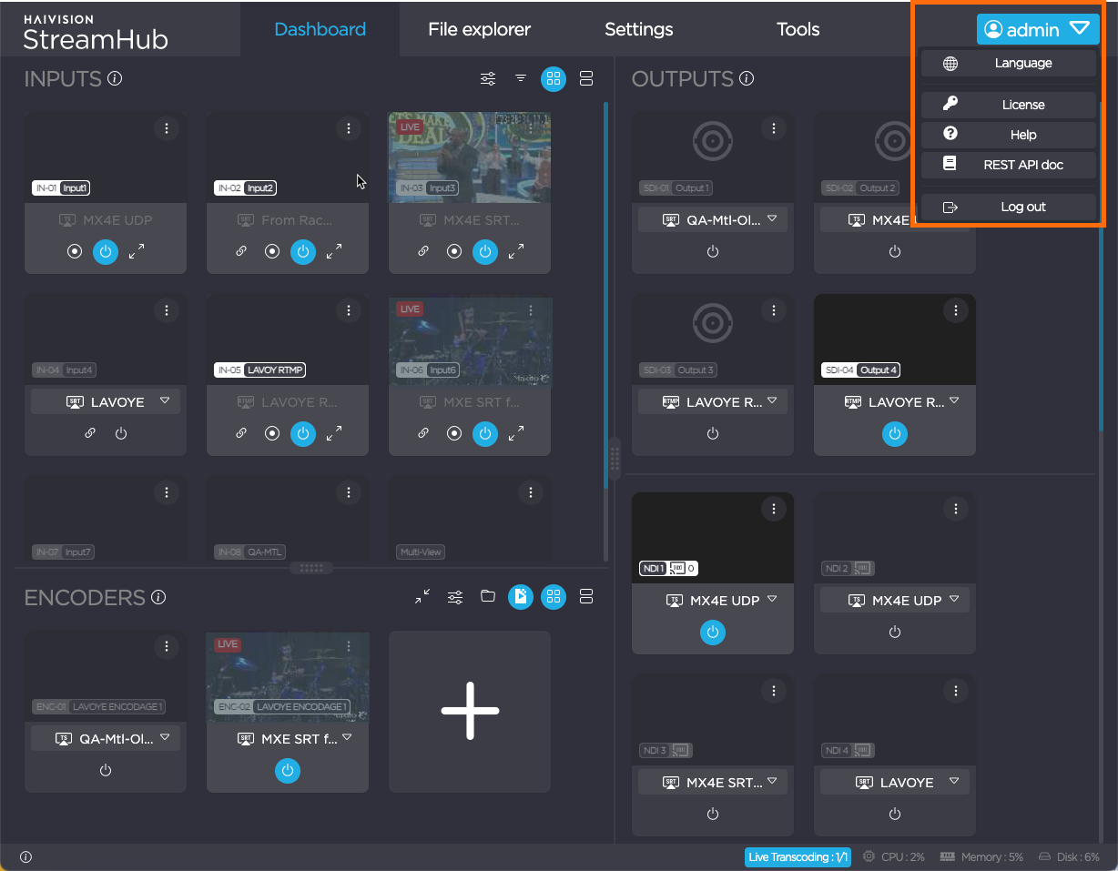 In the top right corner, the dropdown menu allows you to change the operating language, access the license details (see Checking the License) and apply a new license (see Applying a License on the StreamHub), access the Haivision support portal, access the REST API documentation, and log out of StreamHub.