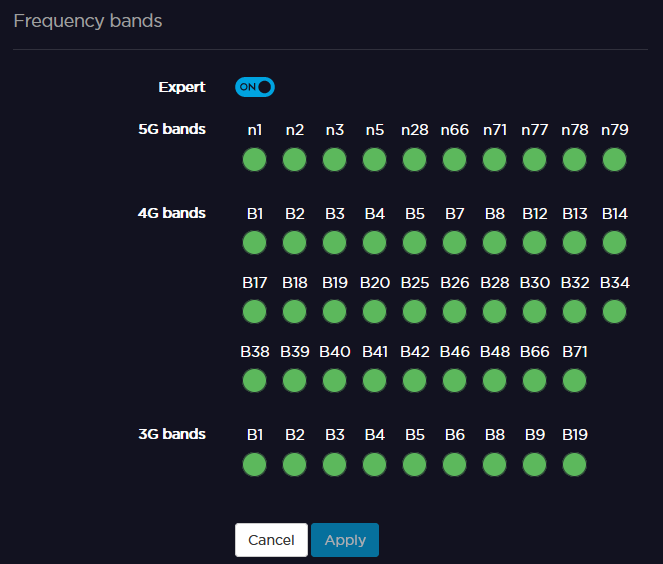 Click to enable Expert Mode. All the cellular bands appear on the screen.