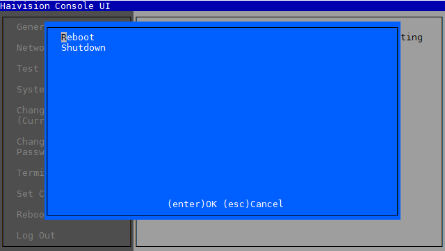 After confirming your selection, the system will either shutdown or reboot (as appropriate). You are then automatically logged off and your secure shell (ssh) connection is closed.