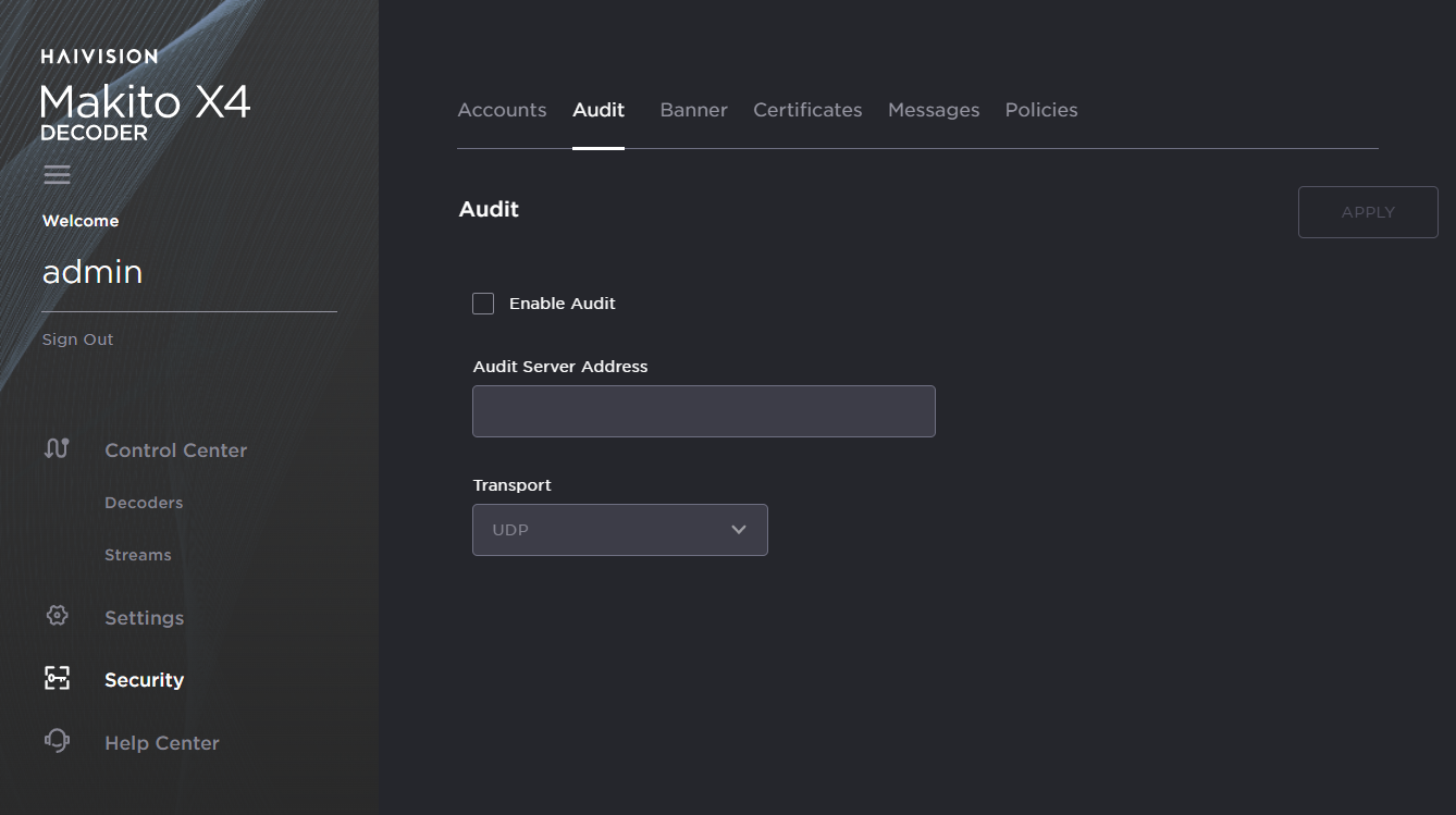 From the Audits page, administrators can set up logging to an Audit server for Makito X4 devices.