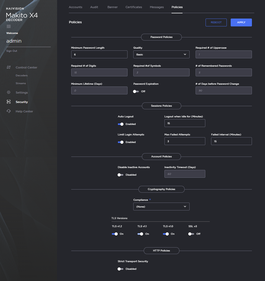 From the Policies page, administrators can set policies for passwords, session timeout, cryptographic strength, and other security criteria for Makito X Series user accounts. These policies will apply to all user accounts; therefore, it is recommended to set the policies before beginning to create accounts.