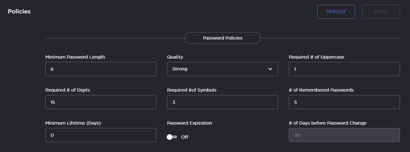 To specify additional password quality criteria, select "Strong" for the Quality and adjust the values as required.